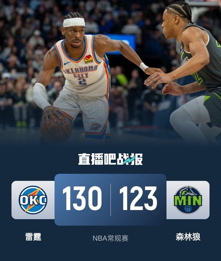 首节开打后雷霆气势如虹,亚历山大连造杀伤单节贡献11分,切特外线续上火力,爱德华兹遭遇严防频频打铁,首节结束时雷霆确立12分优势,次节回来,雷霆多点开花继续拉开比分,但中段局势风云突变,里德连投带罚率队掀起反扑浪潮,森林狼一波18-2一举反超,半场战罢,森林狼领先2分。短暂休整后双方陷入缠斗,亚历山大火力不减对飚爱德华兹,雷霆反超7分进入末节,末节上来,沃克连拿11分再度反超,雷霆连中6记三分扑灭对手反扑势头,森林狼连丢三分回天乏术,最终雷霆130-123击败对手完成复仇。