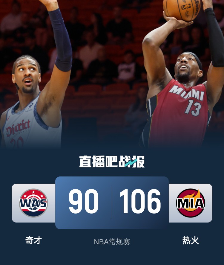 阿德巴约19+14 米德尔顿16分 维金斯&普尔缺战 热火大胜奇才