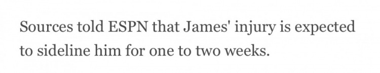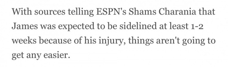 而就在两天前,在McMenamin撰写的湖人不敌篮网的ESPN赛后综述报道中,他仍然援引了Shams关于詹姆斯预计因伤缺席“至少”一到两周的报道。