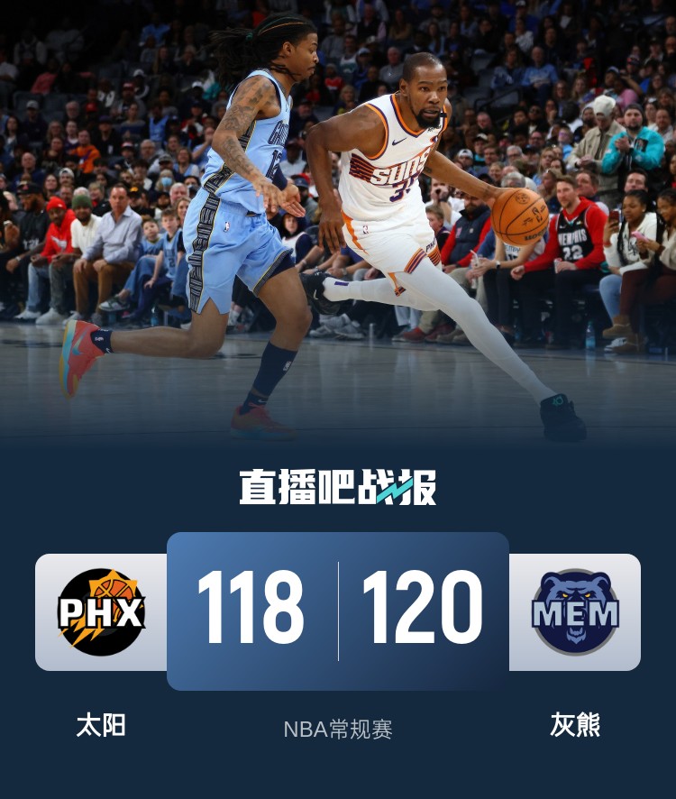 比赛开始,杜兰特率先发力,单节飙中4个三分带队取得两位数领先,次节太阳命中率下降,莫兰特连投带罚帮助球队不断迫近比分,半场战罢太阳59-57领先灰熊2分。易边再战,灰熊多点开花重新占据场上主动,杜兰特和布克联手带队追赶,末节双方争夺陷入白热化,关键时刻莫兰特强攻得手,杜兰特三分续命,但最后绝杀三分不中,最终,灰熊120-118力克太阳,赛季完成横扫。