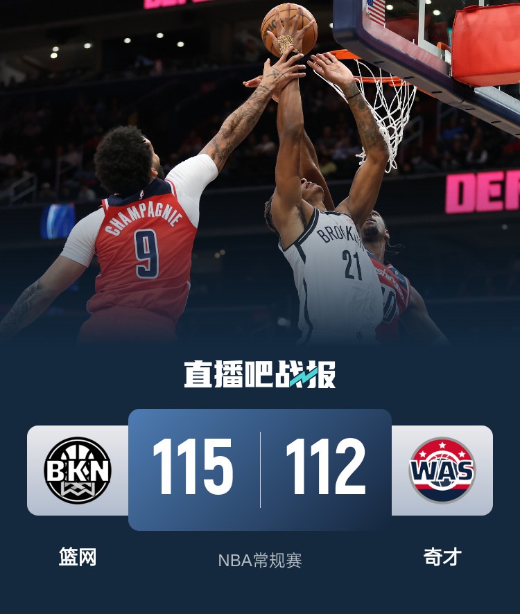 威尔逊20+7 老黄忠&克洛尼伤退 普尔9中2 篮网胜奇才止6连败