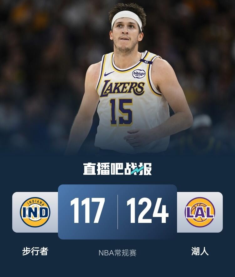 比赛开始,湖人率先发力,里夫斯高效发挥带队很快取得20分的领先,次节湖人命中率下降,步行者连投带罚稍稍缩小分差,半场战罢湖人66-50领先步行者。易边再战,步行者打出16-4追到只差4分,里夫斯和范德比尔特联手回敬15-4的攻击波稳住局势,末节里夫斯连得8分,步行者苦苦追赶无果。最终,湖人124-117击败步行者,取得5连胜。