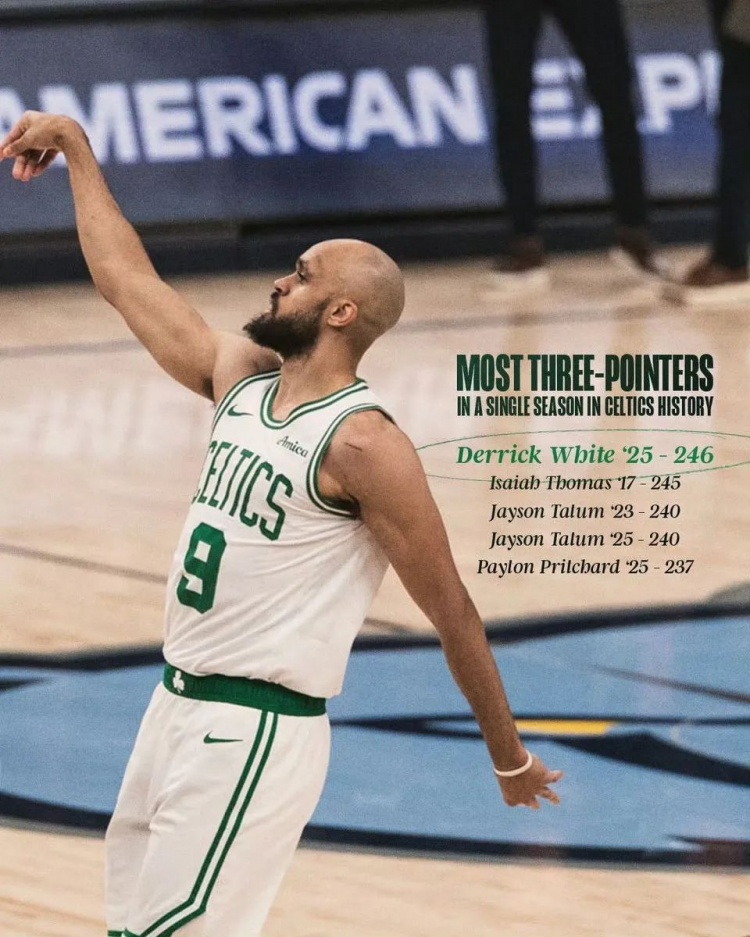 德里克·怀特今天射中本季第247个三分球,凯尔特人队史记录。