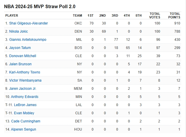 ESPN模拟投票MVP:亚历山大领跑+拿下70张第一选票 约基奇30张