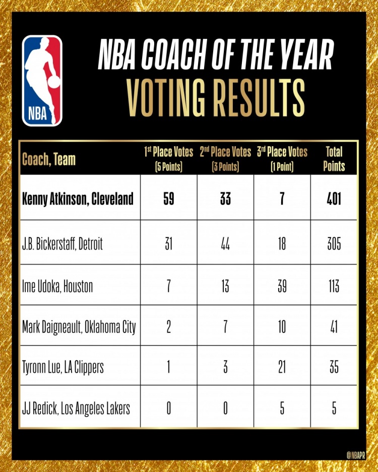 阿特金森在担任骑士队主教练的第一个赛季、也是他个人第5个NBA主教练赛季中,首次荣膺年度最佳教练奖。