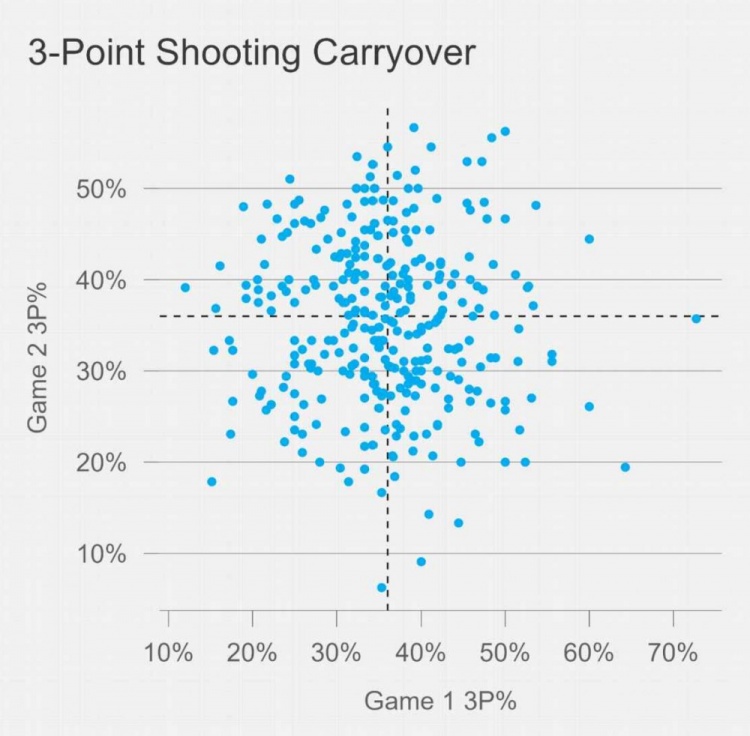 这种投篮失常不会延续到系列赛G2。事实上,系列赛首战的三分命中率对后续比赛的预测价值低得惊人。过去十年的数据显示,系列赛前两战的三分命中率之间毫无相关性。