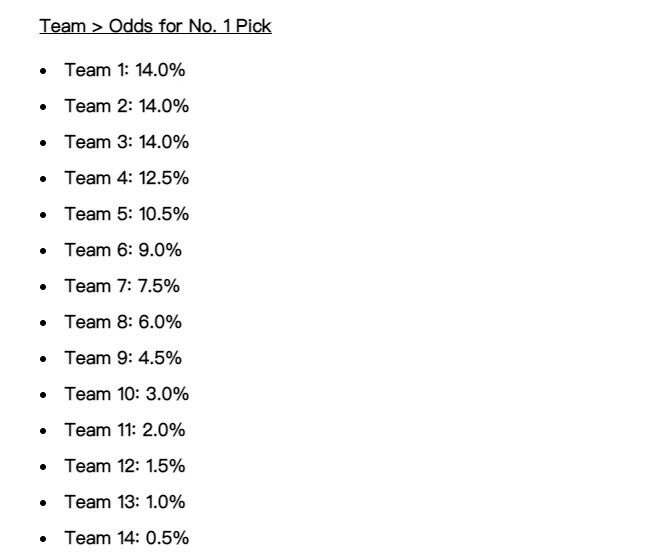 看完上面的内容,相信吧友们已经对乐透抽签已经有了一个大概的了解,但是对抽签具体是怎么进行的、各队抽中状元签的概率如何体现在抽签中还是有点不清楚。不着急,咱们这就来看一看。