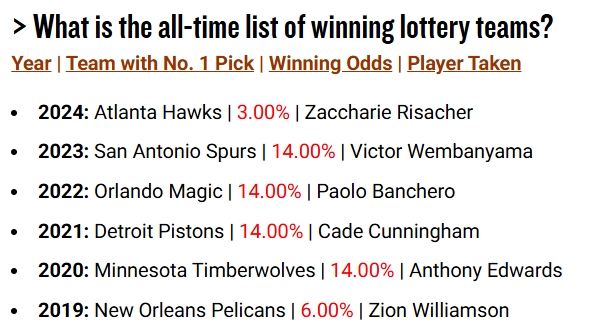 NBA现行的乐透抽签机制是2019年推出的,而自2019年以来,除了鹈鹕(6%)和老鹰(3%)之外,其余4年都是概率最大的球队抽中了状元签。