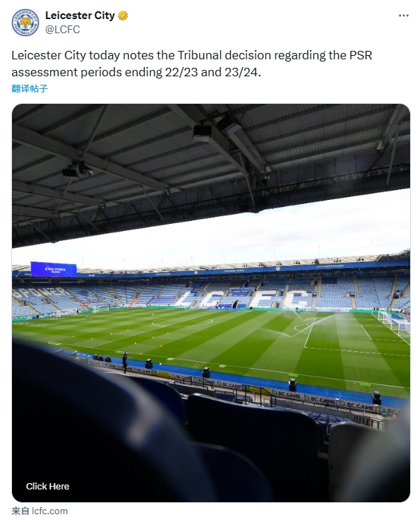 05月20日讯 莱斯特城发布声明,确认仲裁庭驳回了英超针对莱斯特城2023财年违反PSR的上诉。