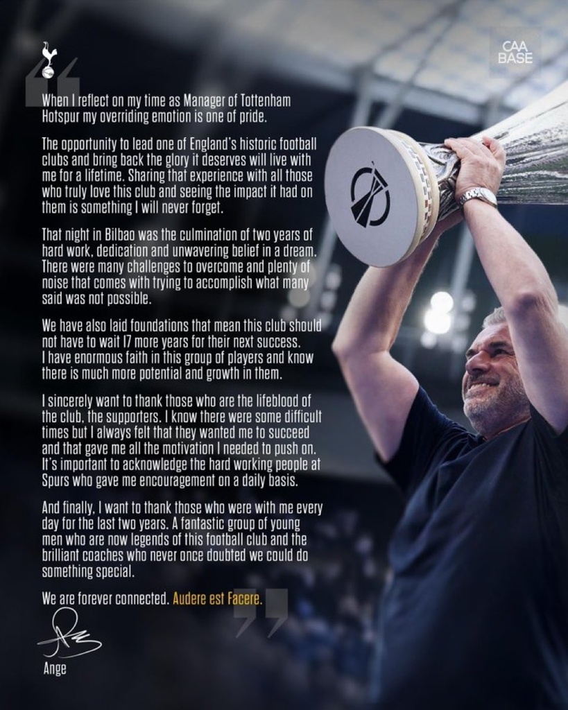澳波社媒告别热刺:回顾两年执教满是自豪,赢得欧联杯将终生难忘