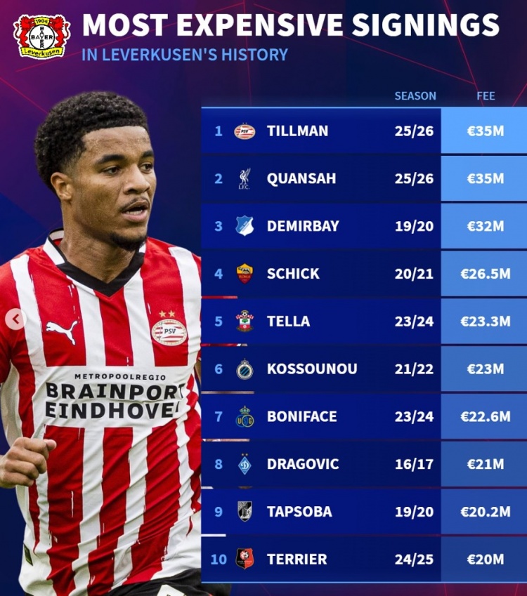 7月12日讯 埃因霍温中场蒂尔曼已经官宣转会勒沃库森,《转会市场》统计显示他也并列为药厂队史标王。