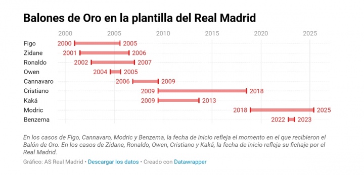据阿斯报统计,皇马在此前25年里每个赛季都至少会有一位金球奖得主,总计有九位金球先生曾出现在皇马更衣室内。2004-05赛季,皇马阵中更是有四名金球奖得主:菲戈、齐达内、大罗以及欧文。而2009年夏天,随着弗洛伦蒂诺重返主席职位,球队签下了卡卡、C罗以及本泽马还有阿隆索。