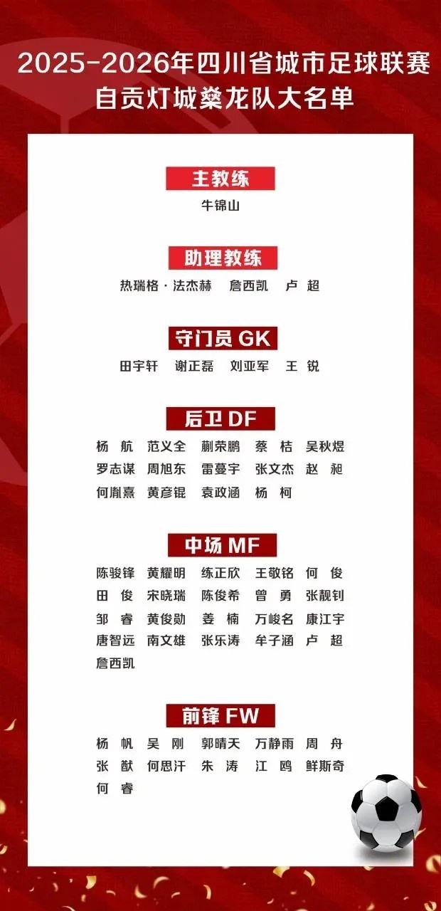 9月5日讯 据“红星新闻”报道,经过前期选拔,“川超”自贡队现已确定了50人的大名单。