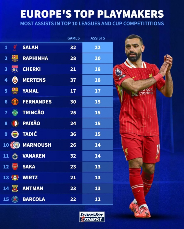 德转列本赛季俱乐部助攻榜:萨拉赫压拉菲尼亚居首,B费&萨卡在列