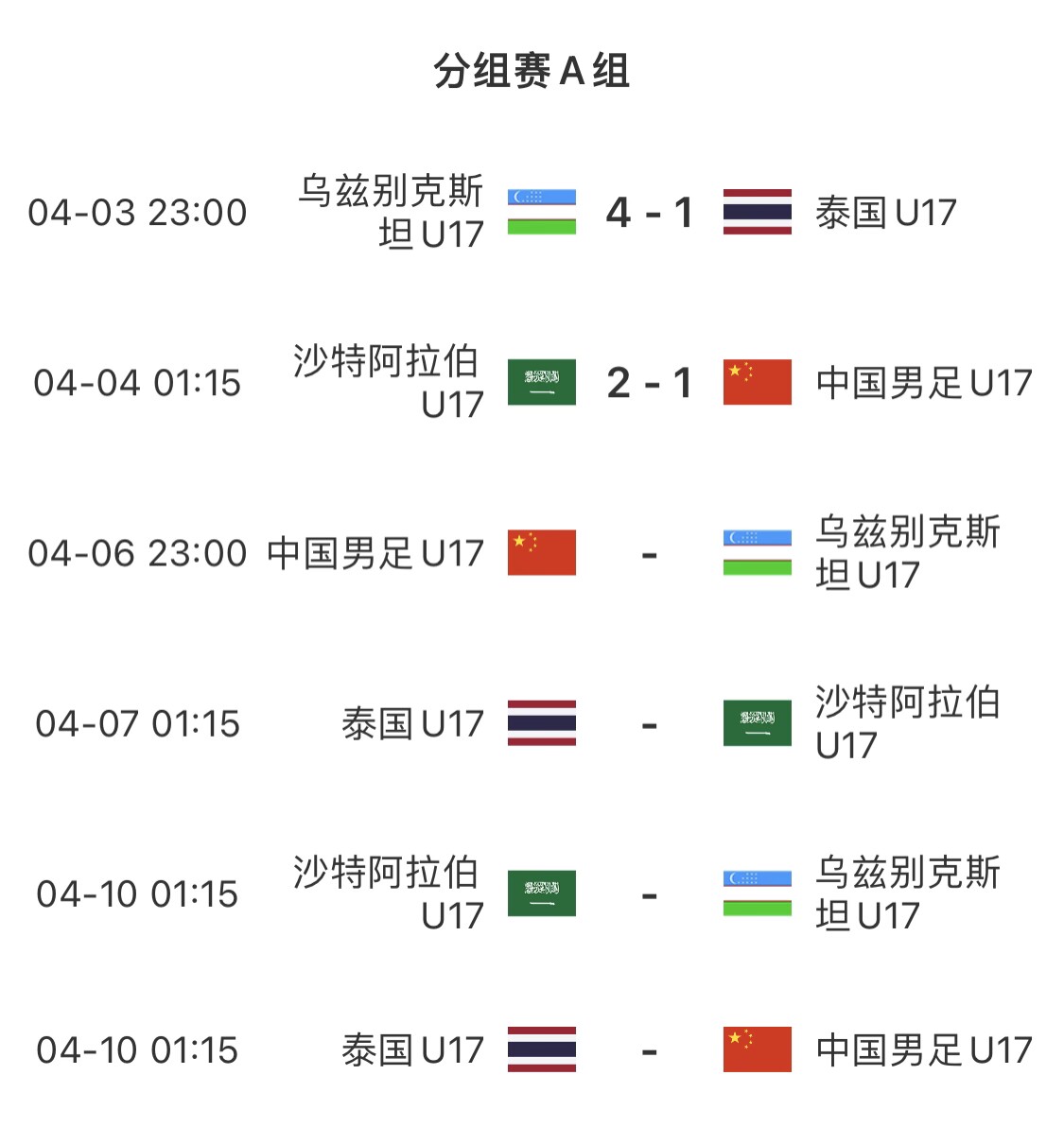 在第一轮比赛中国少1-2不敌沙特U17,次轮两场比赛:中国vs乌兹别克斯坦,泰国vs沙特