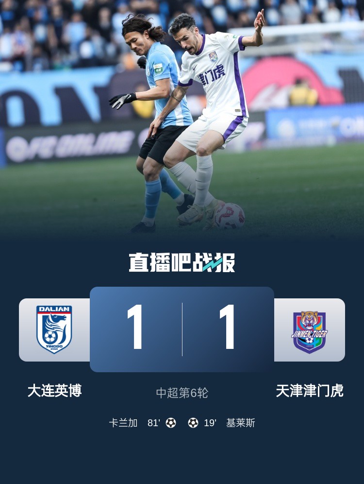 大连英博1-1津门虎皆3轮不胜 基莱斯6场7球领跑射手榜卡兰加扳平