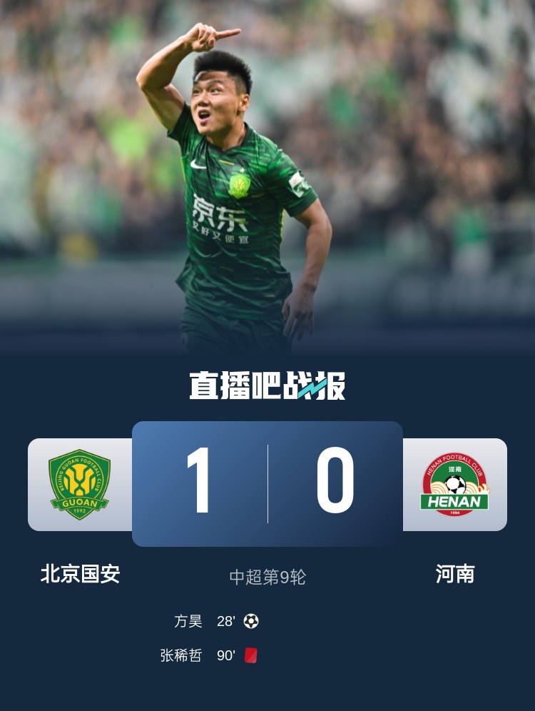 4月25日讯 北京时间4月25日19:35,中超第9轮,北京国安坐镇工人体育场迎战河南队。上半场,法比奥打入一球但越位在先,阿奇姆彭失良机,林良铭助攻方昊劲射破门;下半场,双方互有攻守,但均未能破门,张稀哲踩踏染红。最终,国安1-0击败河南队,积16分升至积分榜第4位,河南队积7分排名第12位。