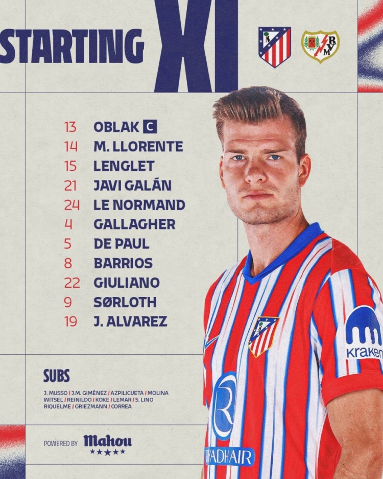 马竞首发:13-奥布拉克、14-马科斯-略伦特、15-朗格莱、21-加兰、24-勒诺尔芒、4-加拉格尔、5-德保罗、8-巴里奥斯、22-朱利亚诺-西蒙尼、9-索尔洛特、19-阿尔瓦雷斯