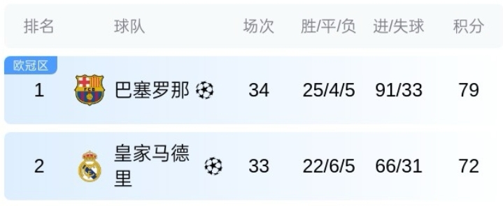 目前皇马33轮积72分位居西甲第二,落后先赛的榜首巴萨7分。塞尔塔46分排第7,身处欧联区。