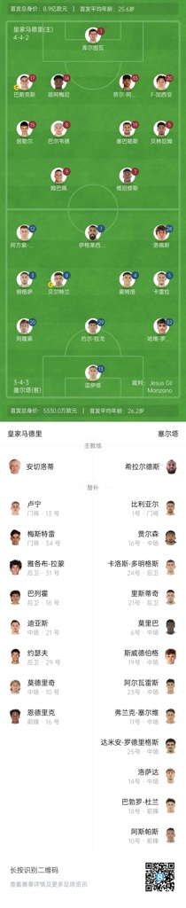 05月04日讯 北京时间今晚20点,西甲第34轮皇马主场迎战塞尔塔。赛前首发阵容已经公布。