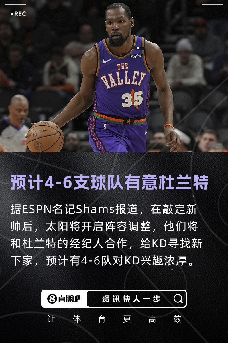 可和新队签两年1.11亿Shams:预计4-6支球队对杜兰特兴趣浓厚