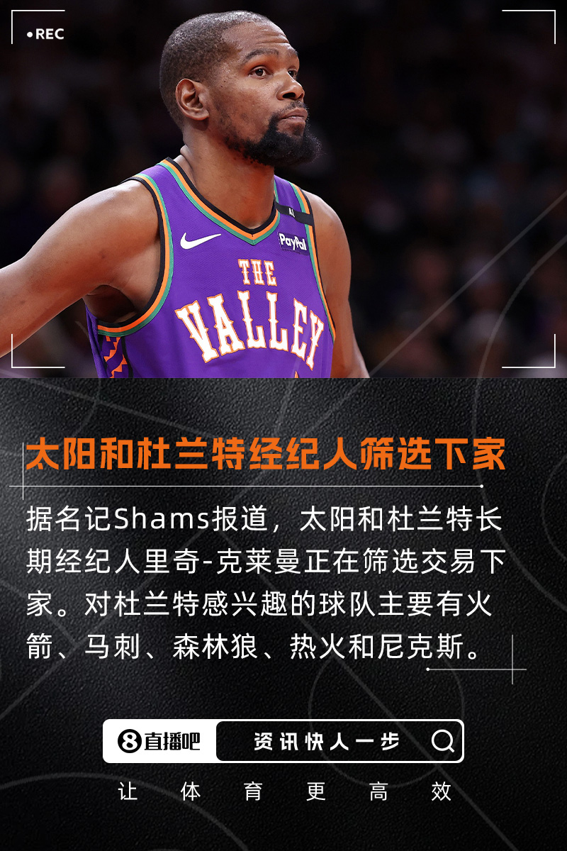 Shams:太阳与杜兰特经纪人正在筛选交易下家 主要有火刺狼热尼
