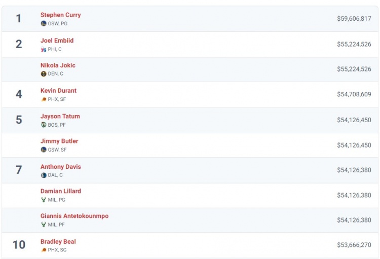巴特勒下赛季薪水联盟第5库里第1 恩比德约基奇KD分列2-4位