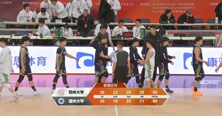 末节决战,温州大学一直紧咬比分,分差也是始终保持在五分以内,比赛直到最后时刻才分出胜负,关键时刻谢忠彩打进扳平两分,但之后温州大学突然断电,苏州大学趁势轰出一波8-0直接带走比赛,最终苏州大学90-86力克温州大学。