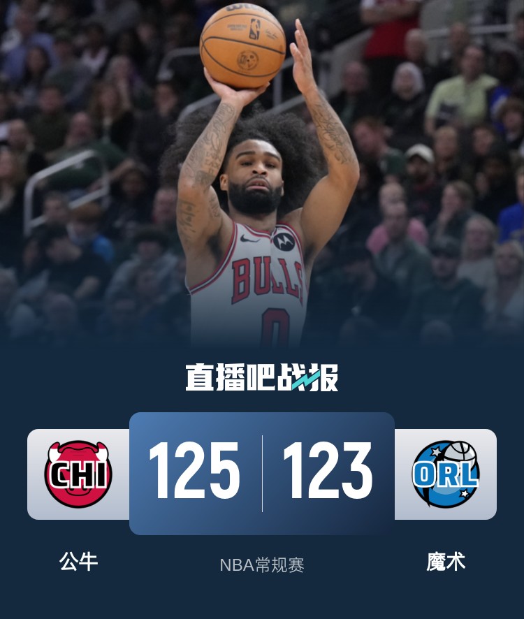 上半场,两队开场便陷入缠斗,比分始终紧咬,魔术轮番冲击内线屡屡暴扣,公牛多点开花给出回应,次节双方继续对攻,公牛全民皆兵,班凯罗连造杀伤还以颜色,半场战罢公牛69-66领先魔术3分。下半场,魔术轰出17-4一度取得两位数领先,公牛多点开花扳平比分,末节双方争夺陷入白热化,关键时刻怀特内外开花连得5分,班凯罗绝杀三分不中,公牛125-123魔术险胜过关。