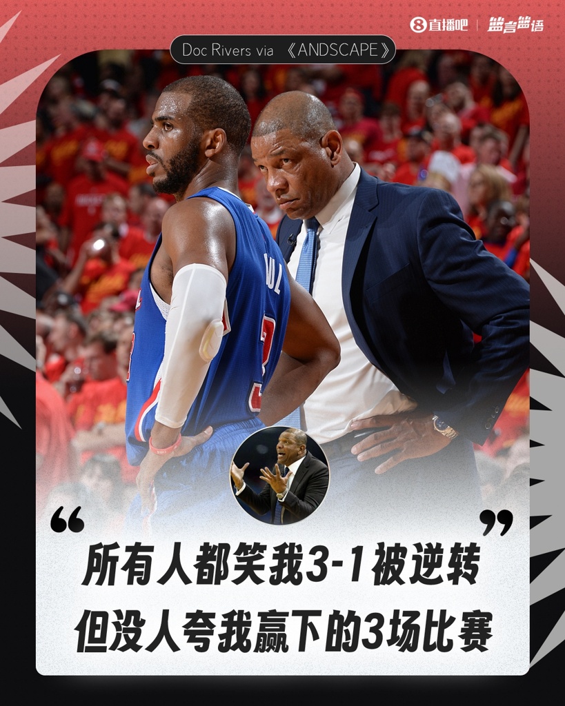 在谈到自己饱受诟病的“系列赛多次3比1领先被翻盘”的话题时,里弗斯坦然表示:“我曾带领一支排名第8的球队3比1领先。在快船的那次是唯一一次让胜利溜走了,没有人讲出真实的故事,没人意识到保罗当时拖着一条伤腿在场上奔跑。这在某种程度上是不公平的,我赢得3场胜利没有得到足够的认可,大家只记住了输掉的比赛。我总是说,‘如果我们6场内输给火箭会怎样?那就没人在意了。’”