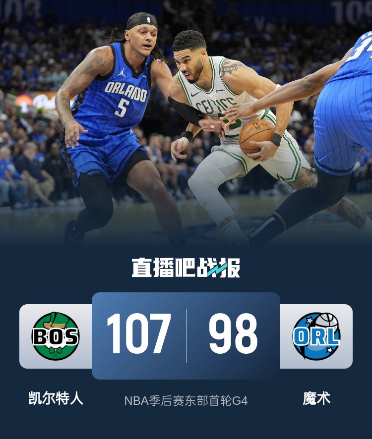 比赛上来,魔术利用主场之势率先进入状态取得领先,不过在首节后半段他们的命中率有所下滑,凯尔特人逐渐完成反超,次节双方的进攻表现都不算好,凯尔特人虽然保持微弱领先却无法拉开分差,半场结束时魔术落后5分;易边再战,魔术继续紧咬比分,分差最小时仅剩1分,但他们始终无法完成反超,末节双方依旧打得难解难分,不过在91-91平后凯尔特人轰出一波10-1的攻势带走比赛,最终凯尔特人拿下魔术大比分3-1获得赛点。