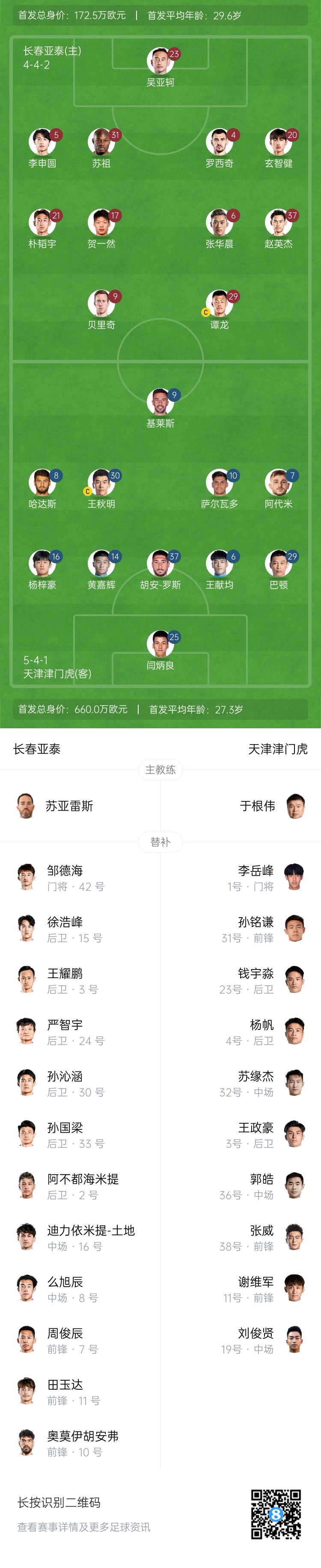 长春亚泰首发:23-吴亚轲、4-罗西奇(F)、5-李申圆、17-贺一然、20-玄智健、31-苏祖(F)、6-张华晨、21-朴韬宇、37-赵英杰、9-贝里奇(F)、29-谭龙
