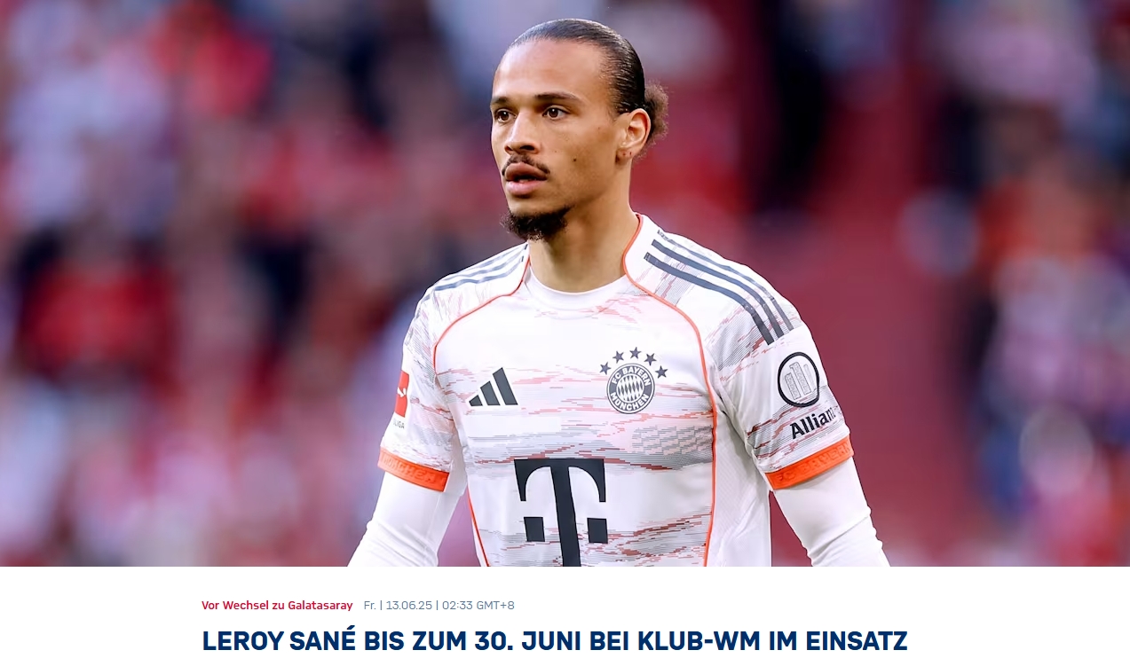 拜仁官方:萨内将随队参加世俱杯至6月30日,随后加盟加拉塔萨雷