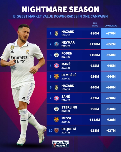 06月17日讯 德国转会市场统计了足坛历史上单赛季球员经历的最大身价下跌,并列出榜单,阿扎尔在这份尴尬的排行榜中居首,甚至两度上榜,内马尔、福登单赛季下跌达5000万分列二三,马内同样两度入榜,19/20赛季的梅西并列第七。