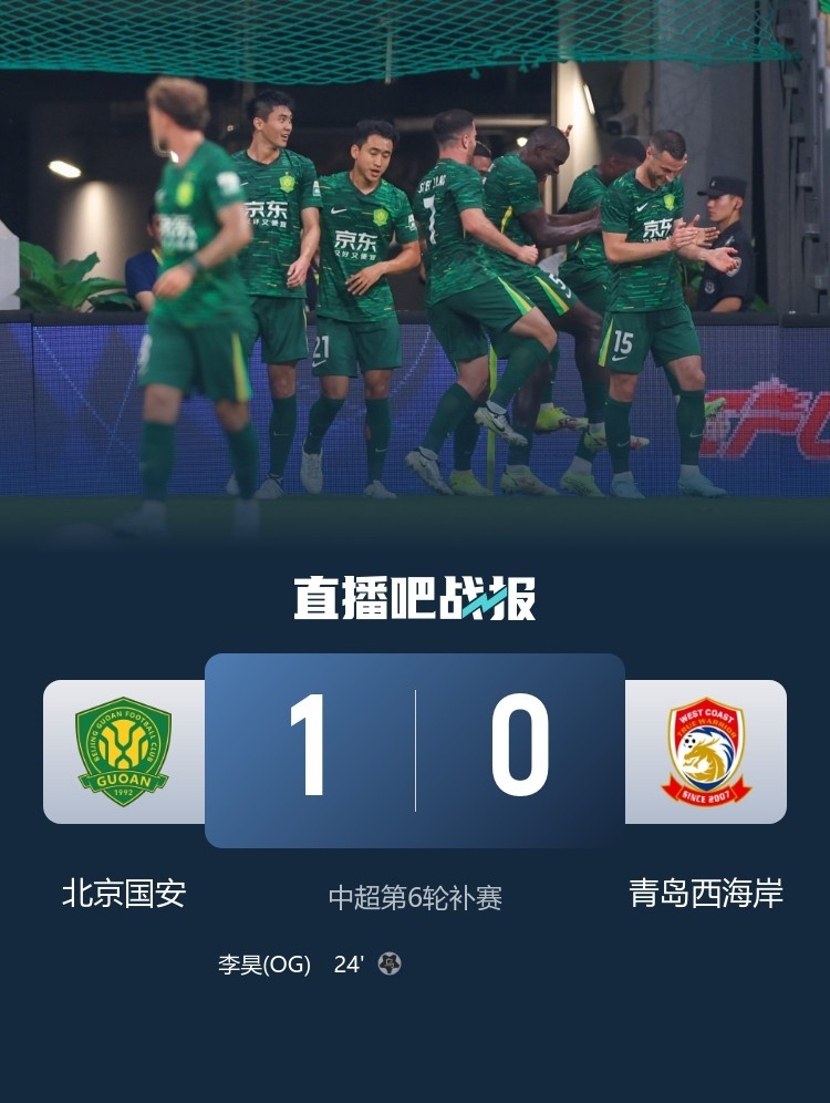 6月17日讯 中超第6轮补赛,北京国安主场1-0击败青岛西海岸,凭借净胜球优势登顶中超联赛积分榜。