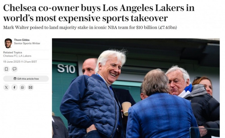 6月19日讯 据电讯报报道,切尔西共同所有者马克-沃尔特将以100亿美元(74.5亿英镑)收购洛杉矶湖人,创全球最昂贵体育收购纪录。