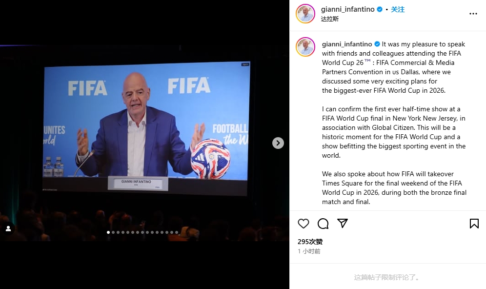 在去年公布2025年世俱杯举办球场时,因凡蒂诺就透露了这一消息,此次会议因凡蒂诺再次确认了推出半场表演。2026年世界杯决赛将在纽约新泽西体育场举行。