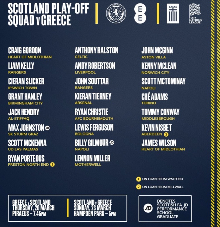 3月11日讯 即将到来的欧国联A联赛升级赛,苏格兰将和希腊进行两回合的比赛。目前,苏格兰已经公布了大名单,罗伯逊、麦克托米奈领衔,蒂尔尼在列。