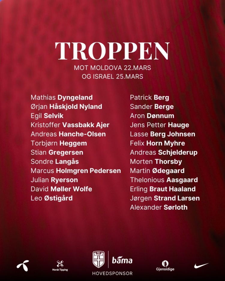 中前场:帕特里克-伯格(博德闪耀)、桑德-博格(富勒姆)、冬纳姆(图卢兹)、彼得-海于格(博德闪耀)、贝格-约翰森(马尔默)、米赫埃(布兰)、谢尔德鲁普(本菲卡)、托斯比(热那亚)、厄德高(阿森纳)、阿斯高(卢顿)、哈兰德(曼城)、拉尔森(狼队)、索尔洛特(马竞)