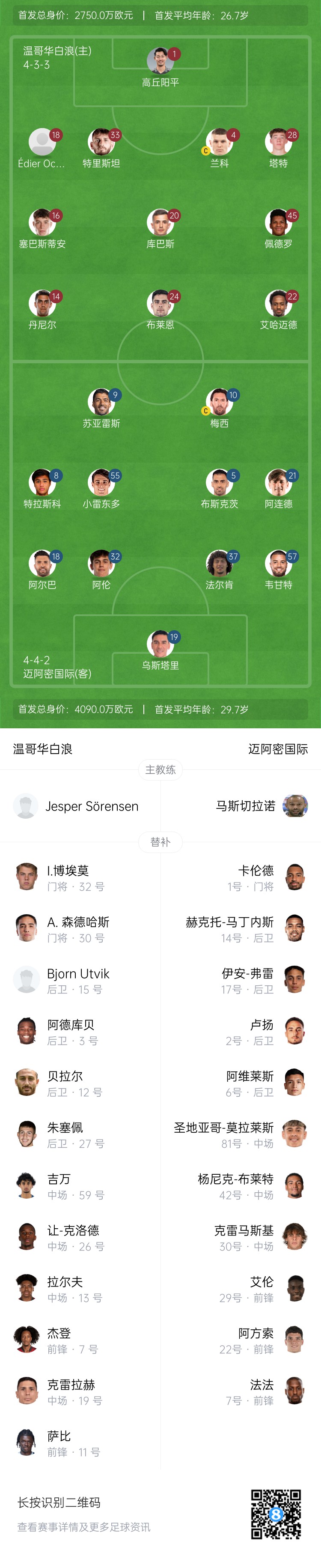 迈阿密国际替补:1-卡伦德、17-弗雷、6-阿维莱斯、2-卢扬、14-马丁内斯、42-布莱特、30-克雷马斯基、81-莫拉莱斯、7-皮考特、29-奥班多、22-阿方索